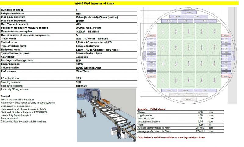 SaleWoodworking machinery > Double saw blade angle sawProducer & type : ADS-630,Drekos made s.r.o Status : New item Input : 50 kW Variant : Double-blade saw Saw blade diameter : 400, 450, 500, 550, 600, Other mm Log diameter (min-max) : 200 - 1500 mm Log length (min-max) : 2500 - 18000 mm Maximum lumber size : 240 x 240 mm Year of manufacture : 2025